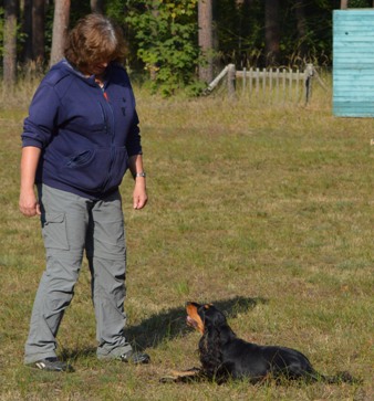 Blickrichtung zum Hund stehen. Der Hundeführer wird dann