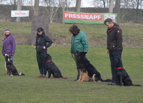 zueinander. Auf Anweisung verlassen die Hundeführer