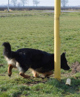 Auf Anweidung wird der Hund um eine 10 m entfernte Pylone