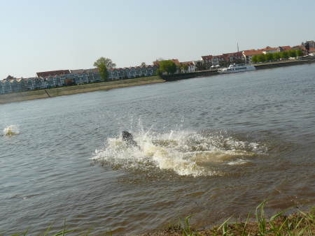 gemacht ;o)) Er schwimmt den Stöckchen hinterher - traut sich aber nicht