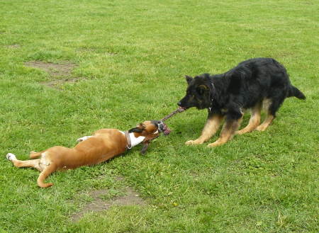 Hundekumpels toben und dann ein wenig Training für's Selbstbewusstsein