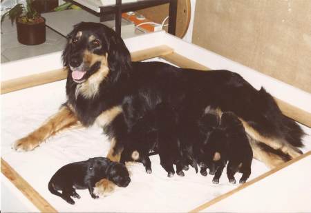 Nachkommen, bis auf einen Welpen alle schwarzmarkenfarben, seine