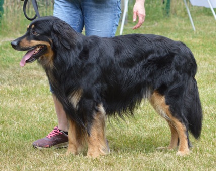 mittelgroßer, mittelkräftiger schwarzmarkenfarbener Rüde,
