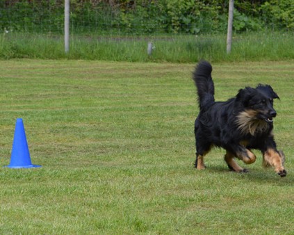 Anweisung wird der Hund um eine 10 m entfernte Pylone