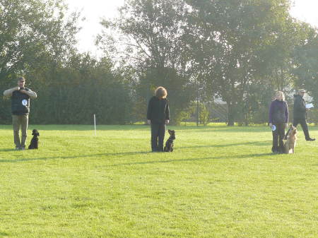 stehen in einem Abstand von 3 m zueinander. Der Hundeführer