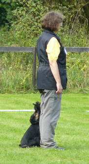 gibt hinter dem Hund die Anweisung an den Hundeführer