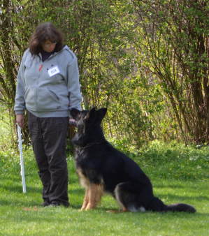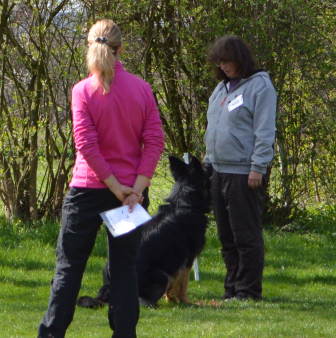 Hundeführer die Anweisung seinen Hund ins sitz zu bringen. Nach ca. 10 Metern erhält der Hundeführer