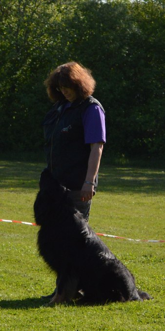 Hundeführer die Anweisung seinen Hund ins steh zu bringen.