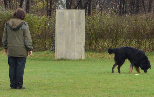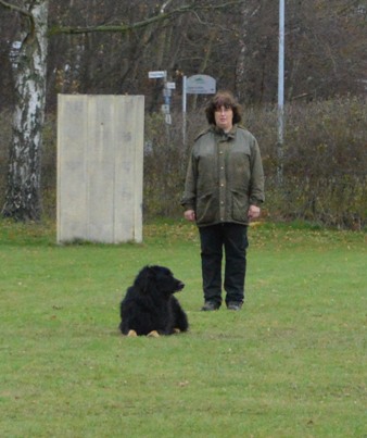 der Hundeführer ca. 10 m von seinem Hund und dreht sich