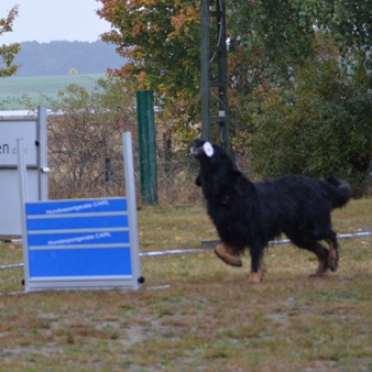 Sprungwand positioniert. Der Hundeführer wirft auf