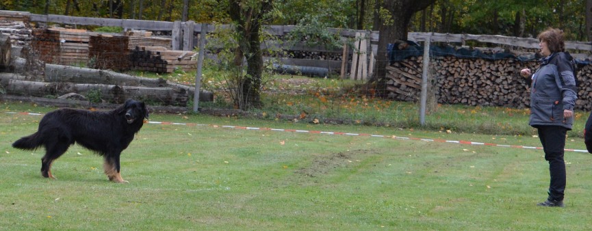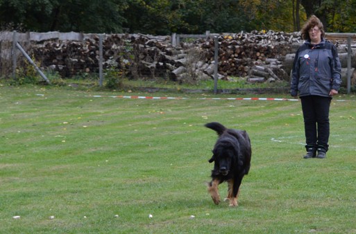 der Hundeführer ca. 10 m von seinem Hund und dreht sich