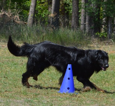 Anweisung wird der Hund um eine 10 m entfernte Pylone