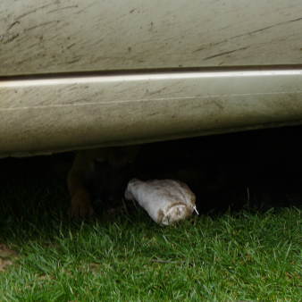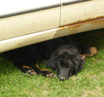 Unkraut zwischen den Hinterbeinen und versucht es sich raus zu ziehen,